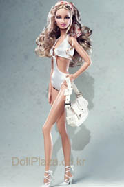 An arty attitude meets the heart of fashion in On Location: South Beach Barbie¢ç doll, shown wearing a white one-piece with cheeky cutouts connected in the front with a dramatic ring. High-heels with ankle straps, hoop earrings and a headscarf pull it all together.