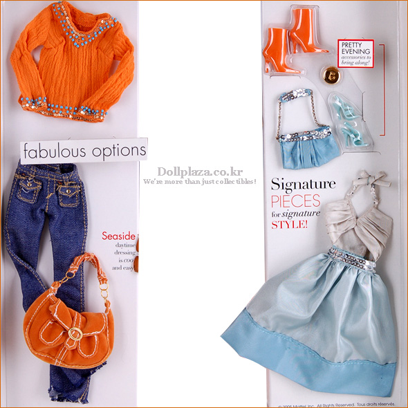 Also includes a pair of denim-like pants, trendy top with sequined detailing, short orange high-heeled boots, and other accessories plus an adorable halter dress with pleated detailing above a full skirt with matching bag and coordinated high-heeled sandals.
