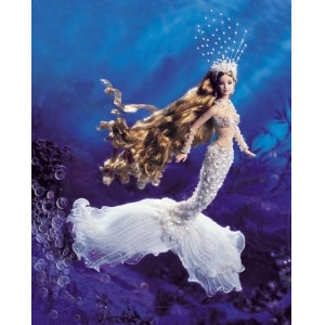 In this fantastical interpretation of a mermaid, Barbie¢ç wears a glamorous silvery white costume.