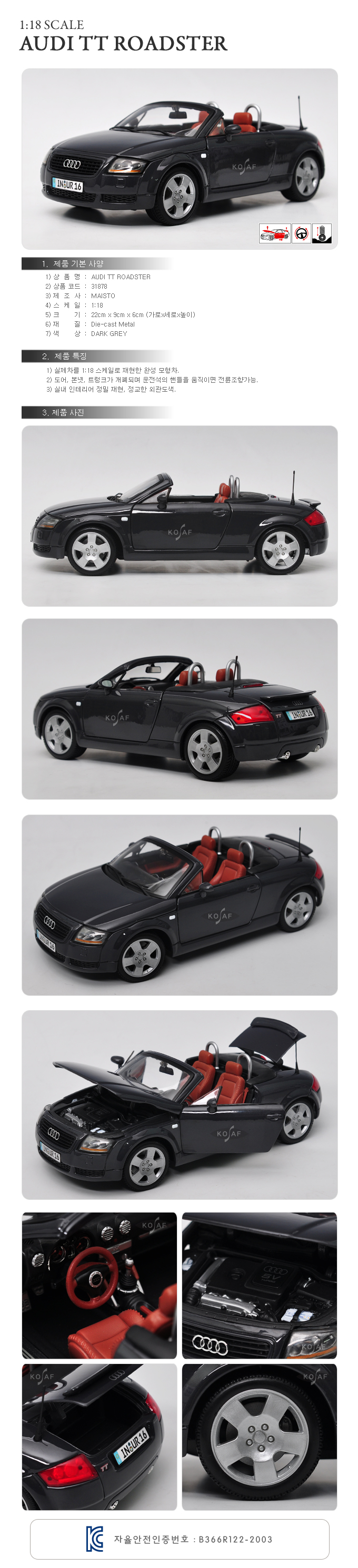 [¸¶À̽ºÅä] 1:18 AUDI TT ROADSTER DARK GREY - 31878/¾Æ¿ìµð/¾Æ¿ìµðTT/¸ðÇüÀÚµ¿Â÷/´ÙÀÌij½ºÆ®